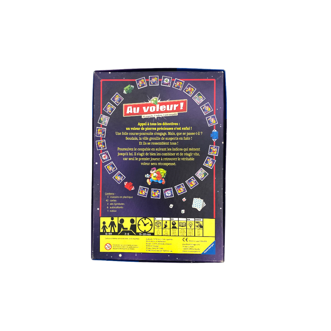 Une folle course poursuite s'engage , mais que se passe -t-il ? Soudain , la ville grouille de suspects en fuite ! Et ils se ressemble tous ! Poursuivez le coupable en suivant les indices qui ...mènes jusqu’à lui. Il s'agit de bien combiner et de réagir vite, car le seul le premier joueur à retrouver le véritable voleur sera récompensé.