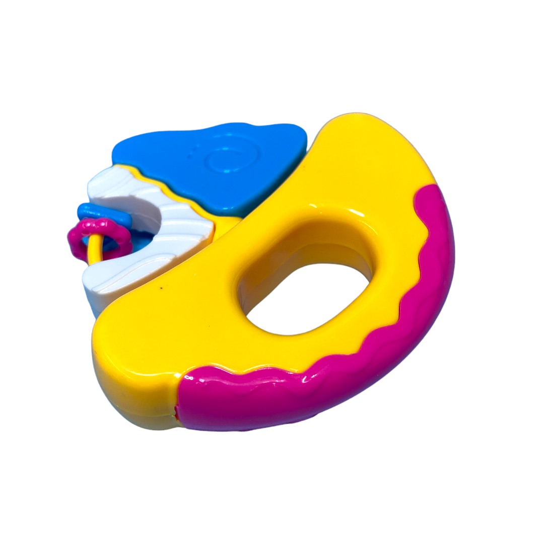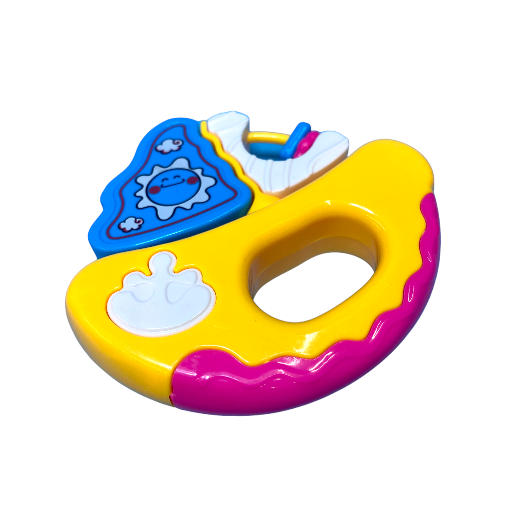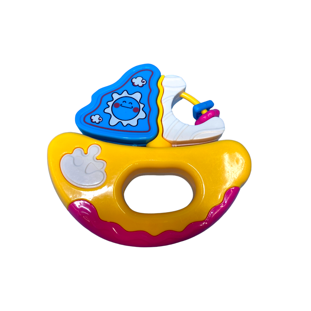 Petit hochet voilier jaune avec différentes matières et textures (miroir...).