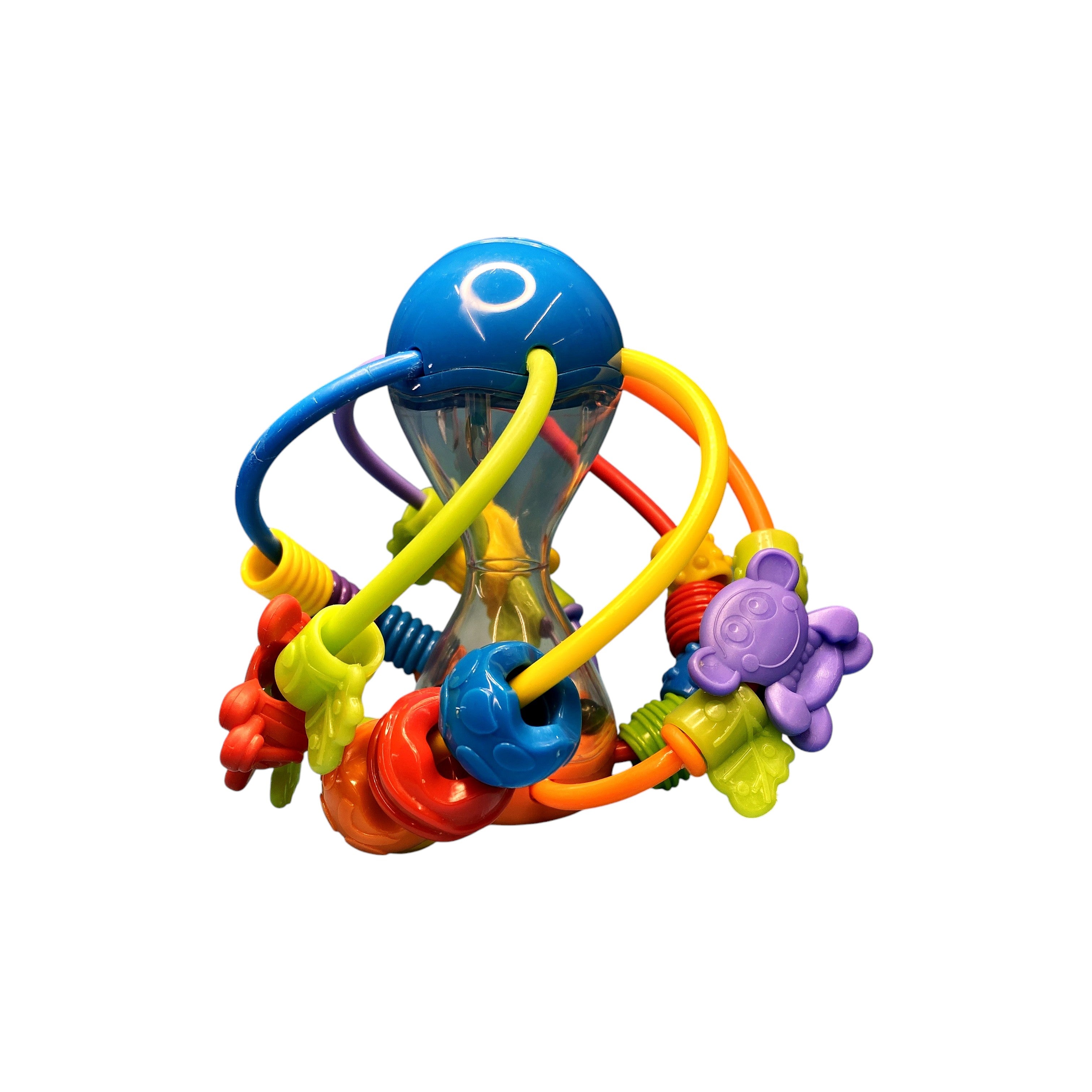 Vous pouvez aussi retrouver plusieurs petits anneaux multicolores de formes diverses qui glissent le long des tiges, parfaits pour le développement de bébé mais aussi des perles de dentition. La balle J’Apprends en Jouant stimule les sens avec ses multiples fonctions.