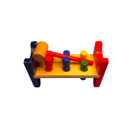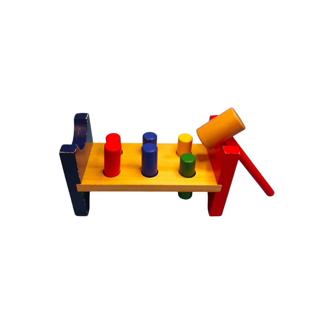 L'enfant s'amuse à jouer au petit bricoleur en tapant sur les différentes pièces en bois.