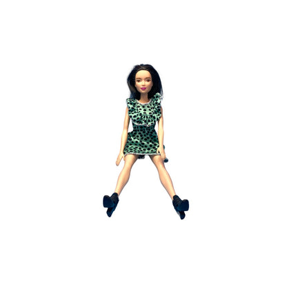 Poupée Barbie chevelure noire, portant une robe courte avec des pois et des chaussures noires.