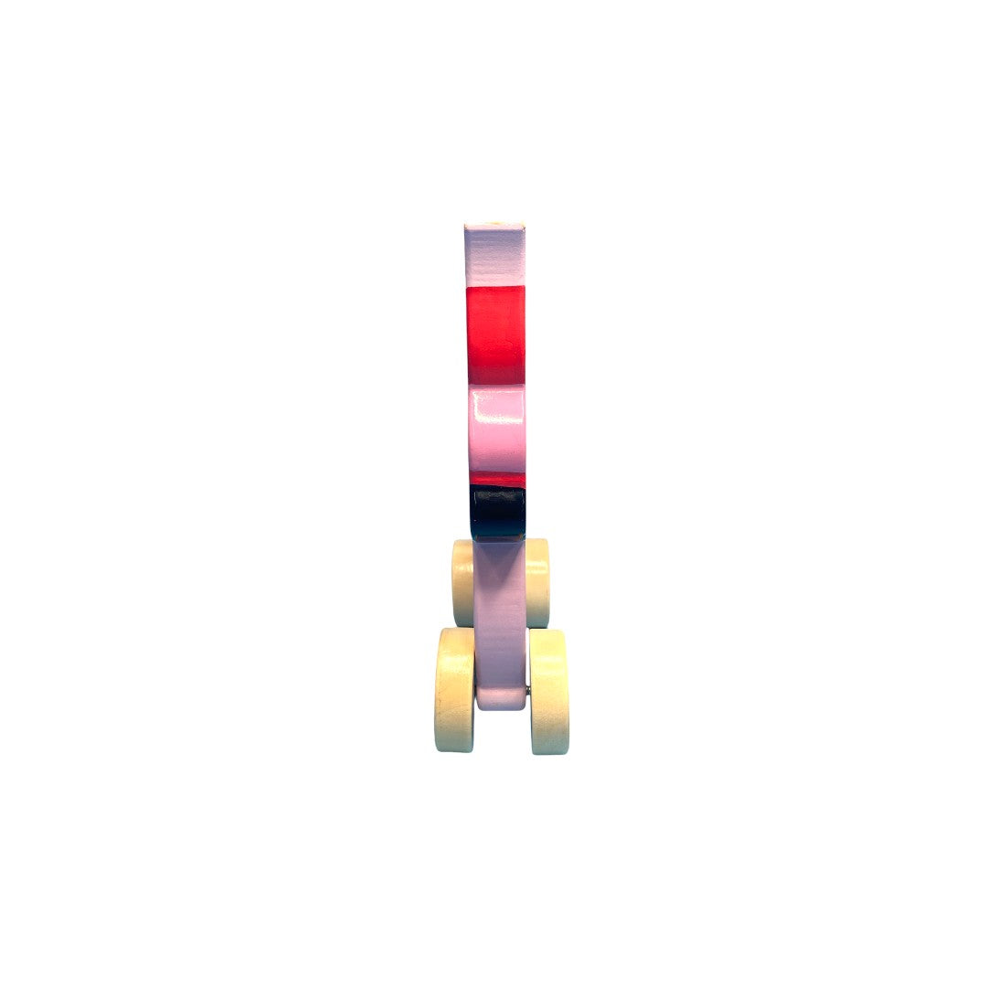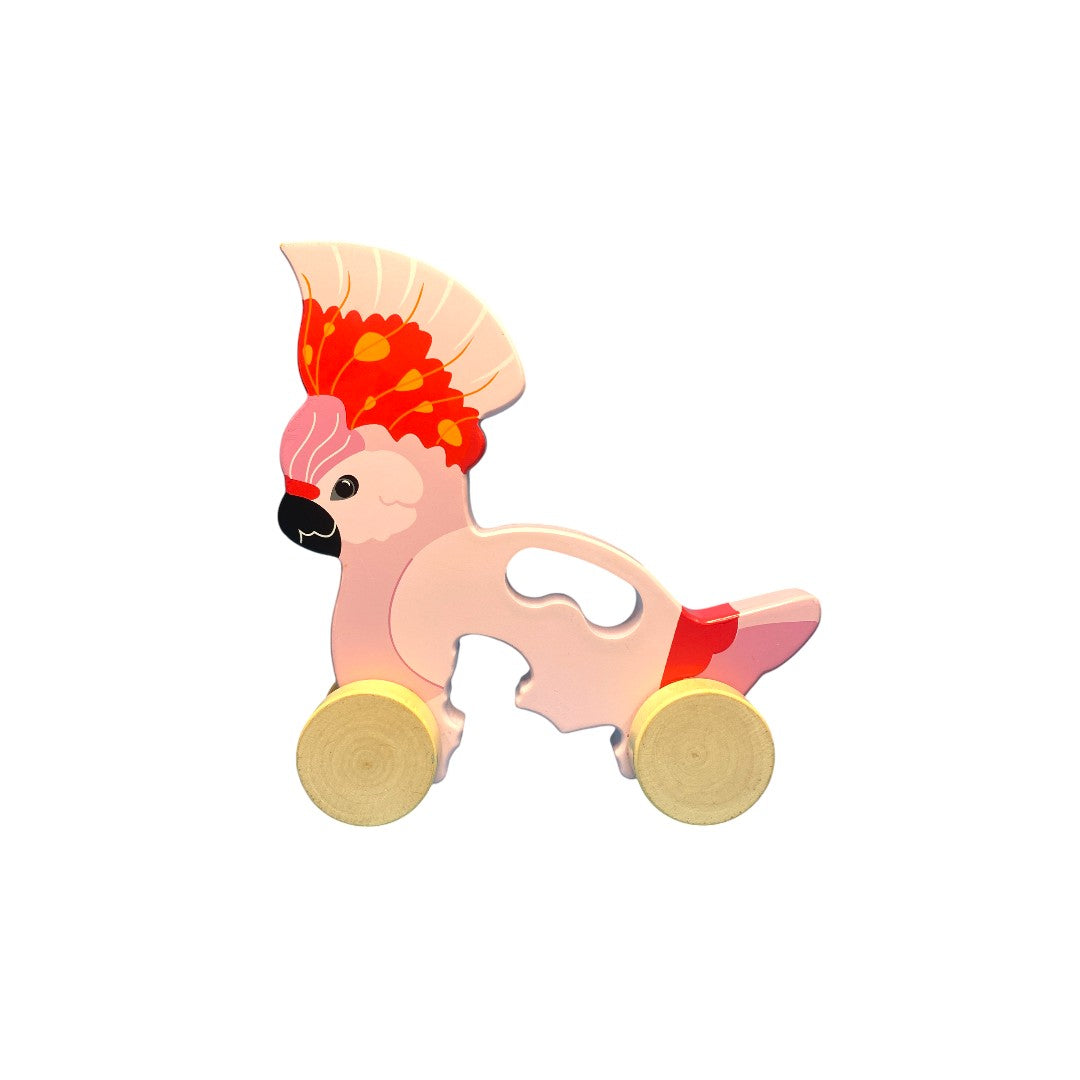 Perroquet cacatoès rose en bois à tirer sur des petites roues.