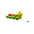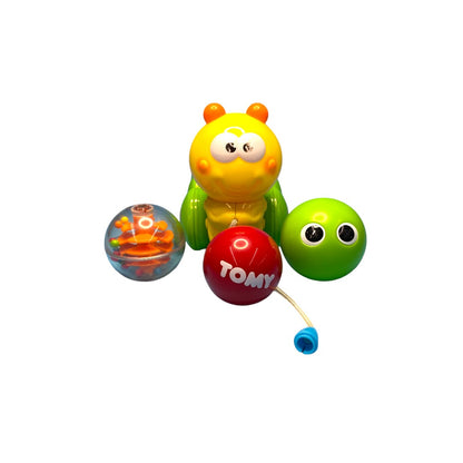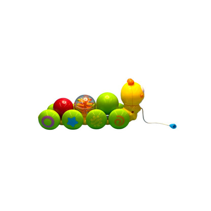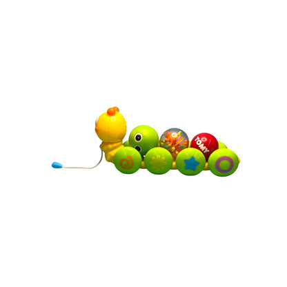 Chenille à tirer et transportant 3 balles de couleurs différentes.
