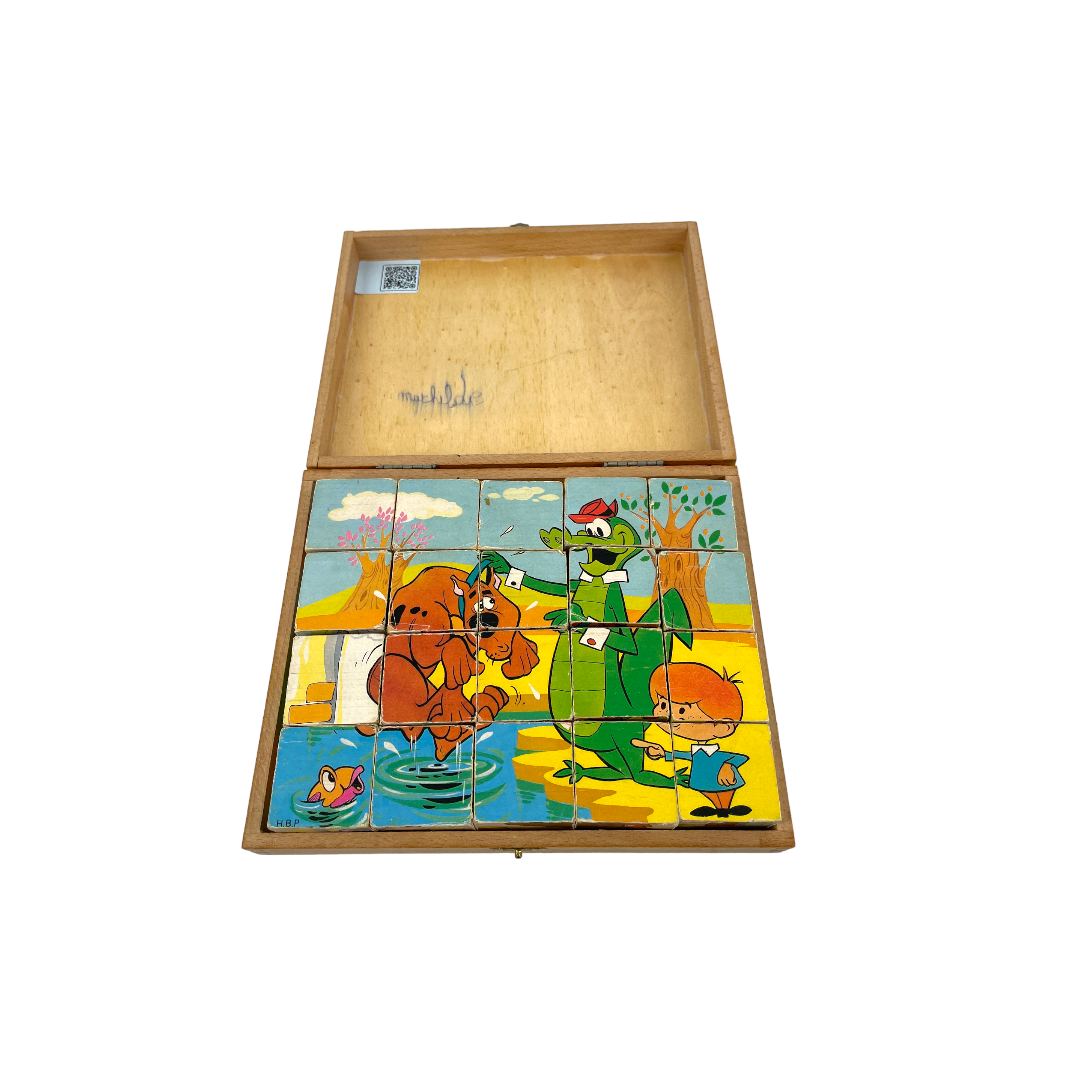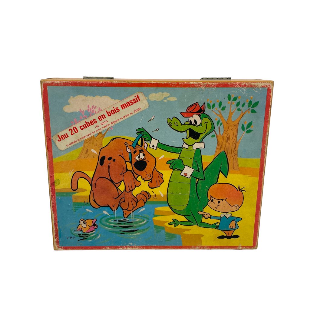 Mallette en bois avec 20 cubes puzzles sur le thème Hanna Barbera, Wally Gator et Scooby-Doo. L'enfant peut s'amuser à reproduire les puzzles ou bien imaginer différentes constructions avec le...s cubes en bois.
