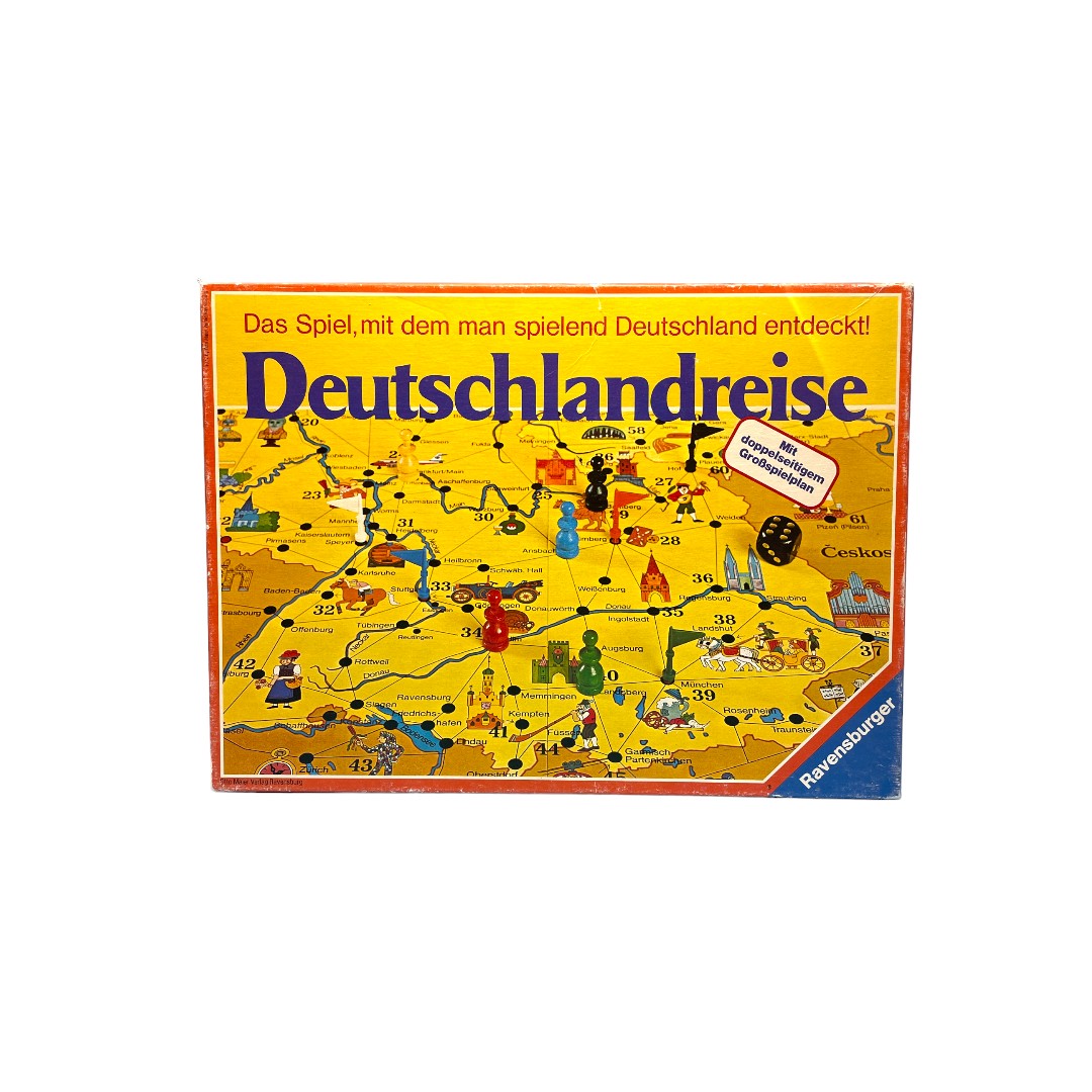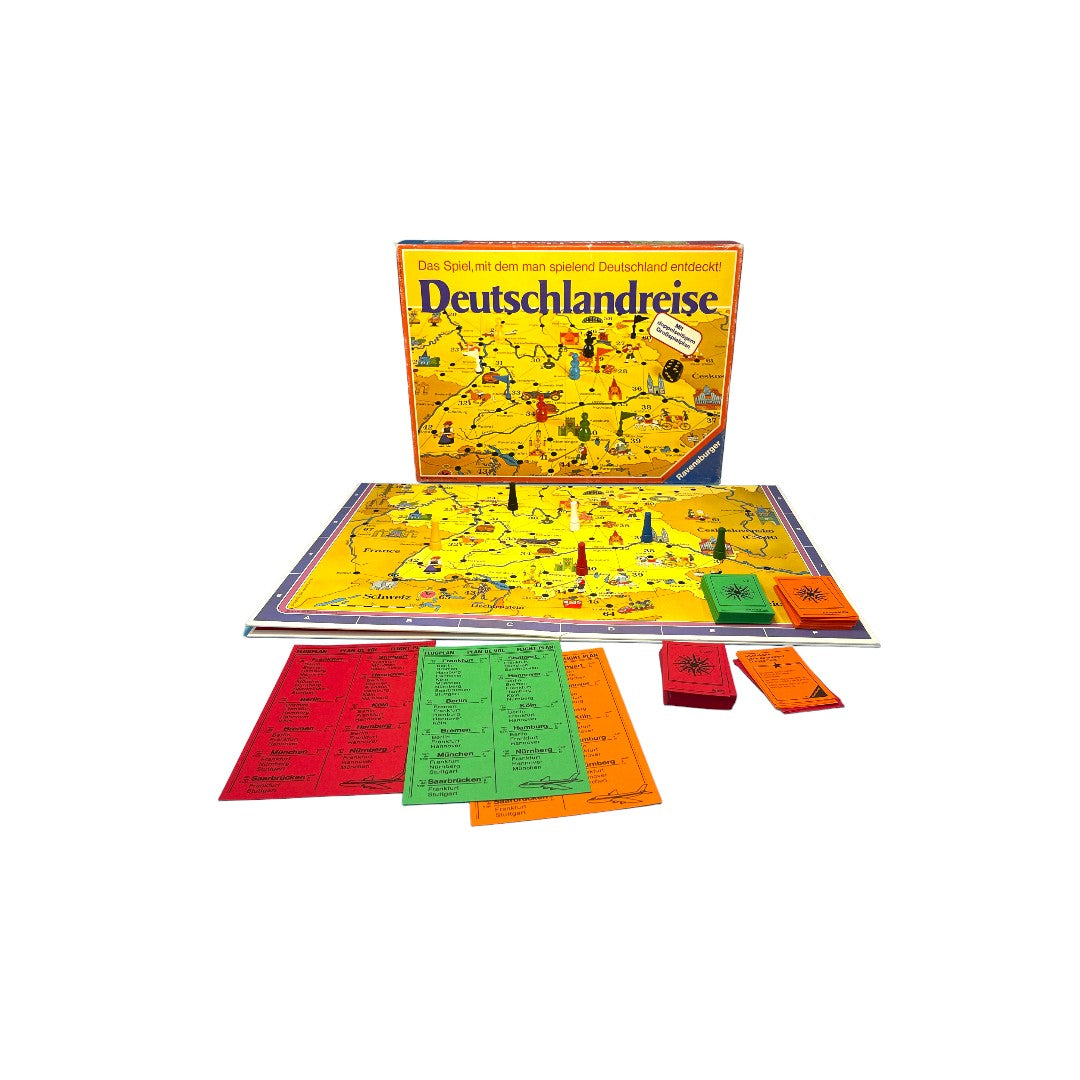 Avec ce jeu les joueurs effectuent un voyage imaginaire à travers l'Allemagne et ses régions frontalières. 6cartes-villes tirées au sort sont, pour chaque joueur, le départ d'un programme de v...oyage à chaque fois différent. Chaque joueur doit visiter un certain nombre de villes. Il est libre d'effectuer ces visites dans l'ordre qui lui plait et il lui faut, tout en tenant compte des indications donnés par les cartes-ville, choisir l'itinéraire le plus cour. Ce jeu passionnant permet aussi d’acquérir quelques notions de géographie. Il est complété par des informations touristiques, en texte et en image, sur 69 villes.