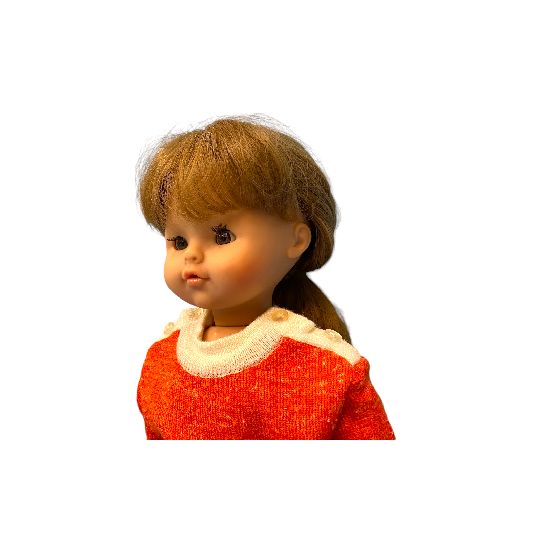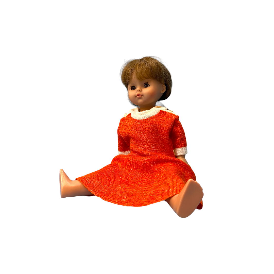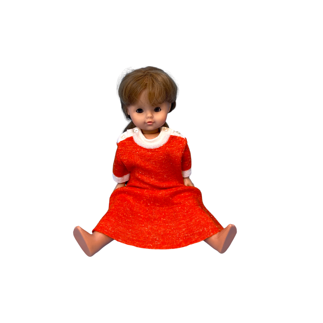 Poupée habillée d'une longue robe en laine orange avec un col blanc. Les enfants prendront plaisir à coiffer ses longs cheveux bruns.