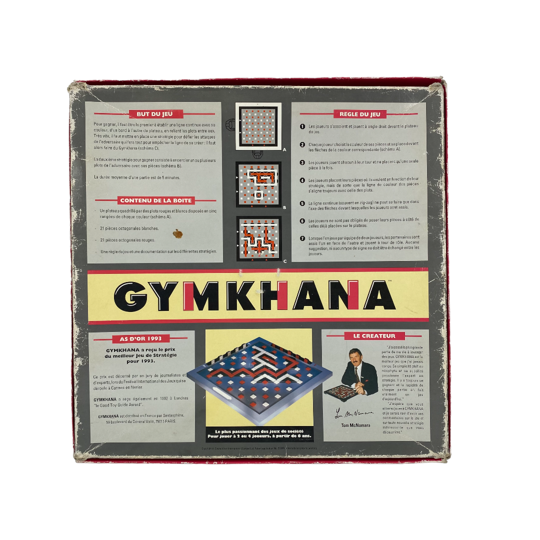 Un jeu de stratégie de Tom McNamara. Pour gagner, il faut être le premier à établir un ligne continue avec sa couleur, d'un bord à l'autre du plateau, en reliant les plots entre eux. Très vite..., il faut mettre en place une stratégie pour défier les attaques de l'adversaire qui fera tout pour empêcher la ligne de se créer : il faut alors faire du Gymkhana.