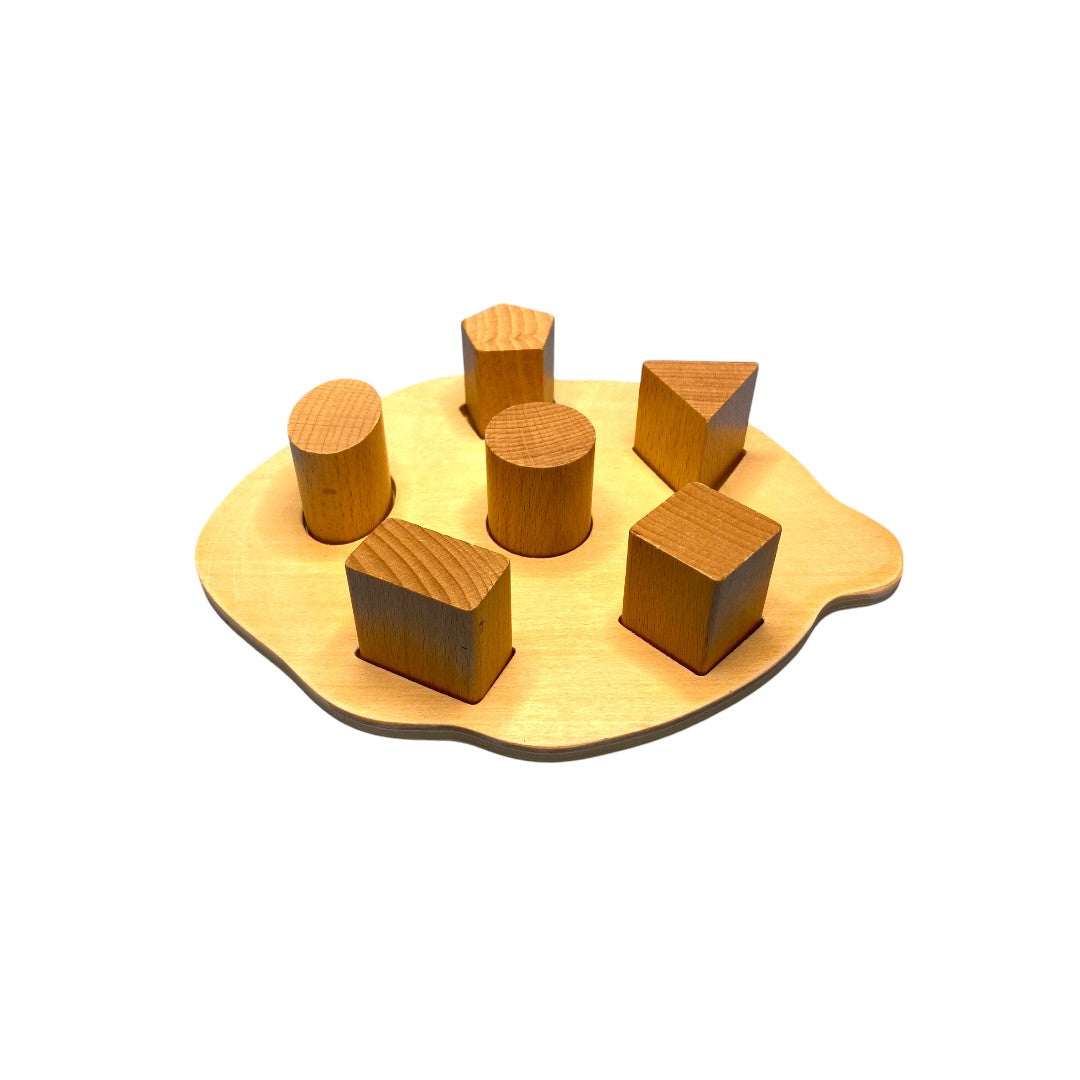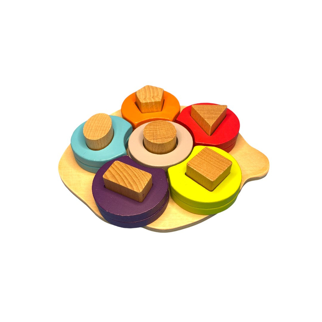 Jouet en bois à empiler en forme de fleur, composé de 10 éléments de formes et couleurs différentes.