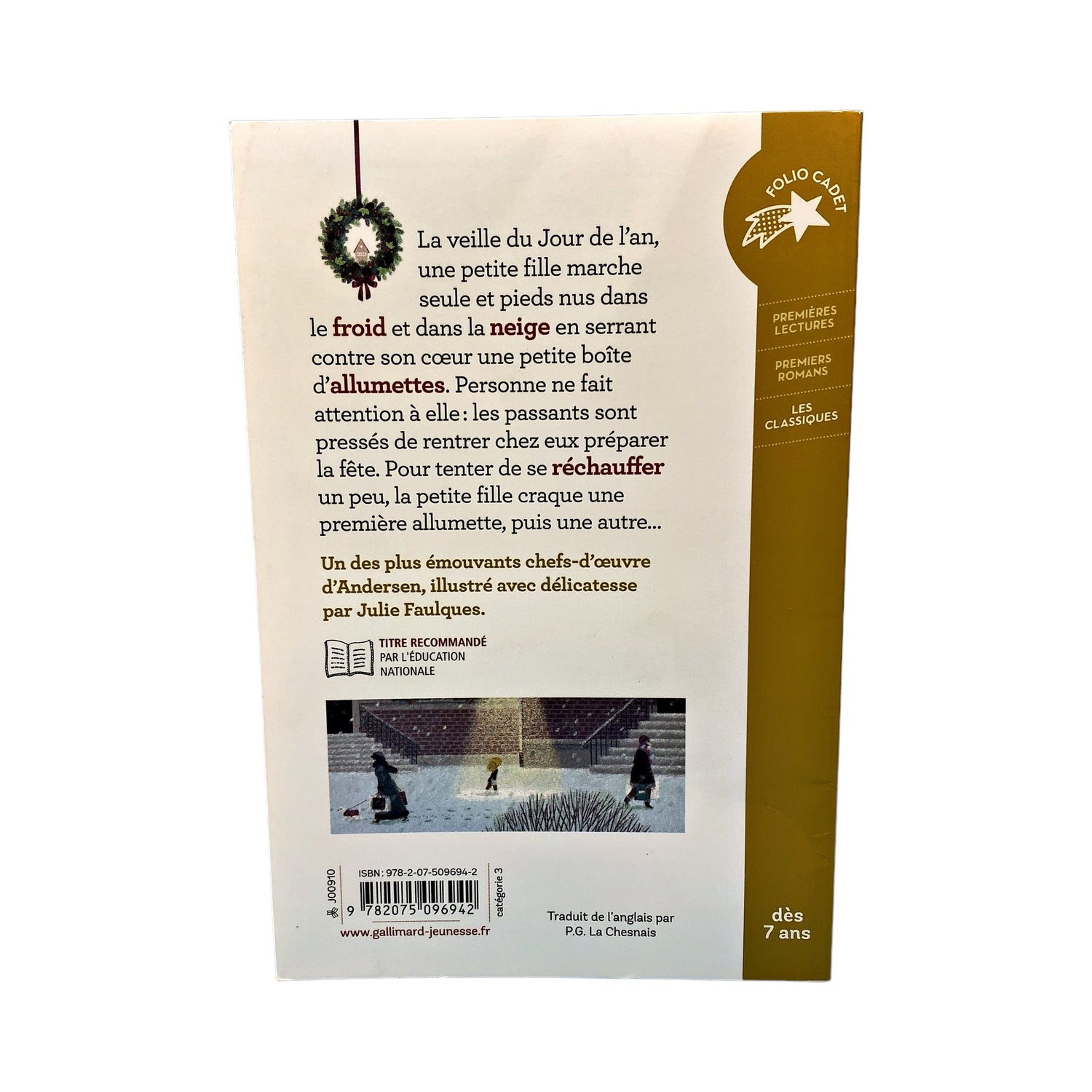 La veille du Jour de l'an, une petite fille ...marche seule et pieds nus dans le froid et dans la neige en serrant contre son cœur une petite boîte d'allumettes. Personne ne fait attention à elle : les passants sont pressés de rentrer chez eux préparer la fête. Pour tenter de se réchauffer un peu, la petite fille craque une première allumette, puis une autre...