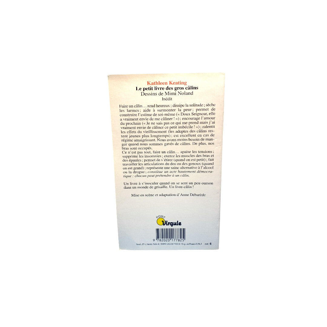 Auteur : Kathleen Keating Faire un câlin... rend heureux ; dissipe la solitude ; sèche les larmes : aide à surmonter la peur : permet de construire l'estime de soi-même (" Doux Seigneur, ell...e a vraiment envie de me câliner ! ") ; encourage l'amour du prochain (" Je ne sais pas ce qui me prend mais j'ai vraiment envie de câliner ce petit imbécile ! ") ; ralenti les effets du vieillissement (les adeptes des câlins restent jeunes plus longtemps) ; est excellent en cas de régime amaigrissant. Nous avons moins besoin de manger quand nous sommes gavés de câlins. De plus, nos bras sont occupés. Référence : 9782020177825