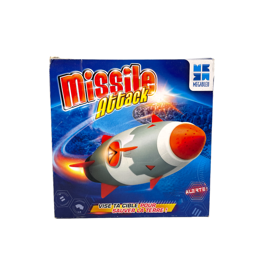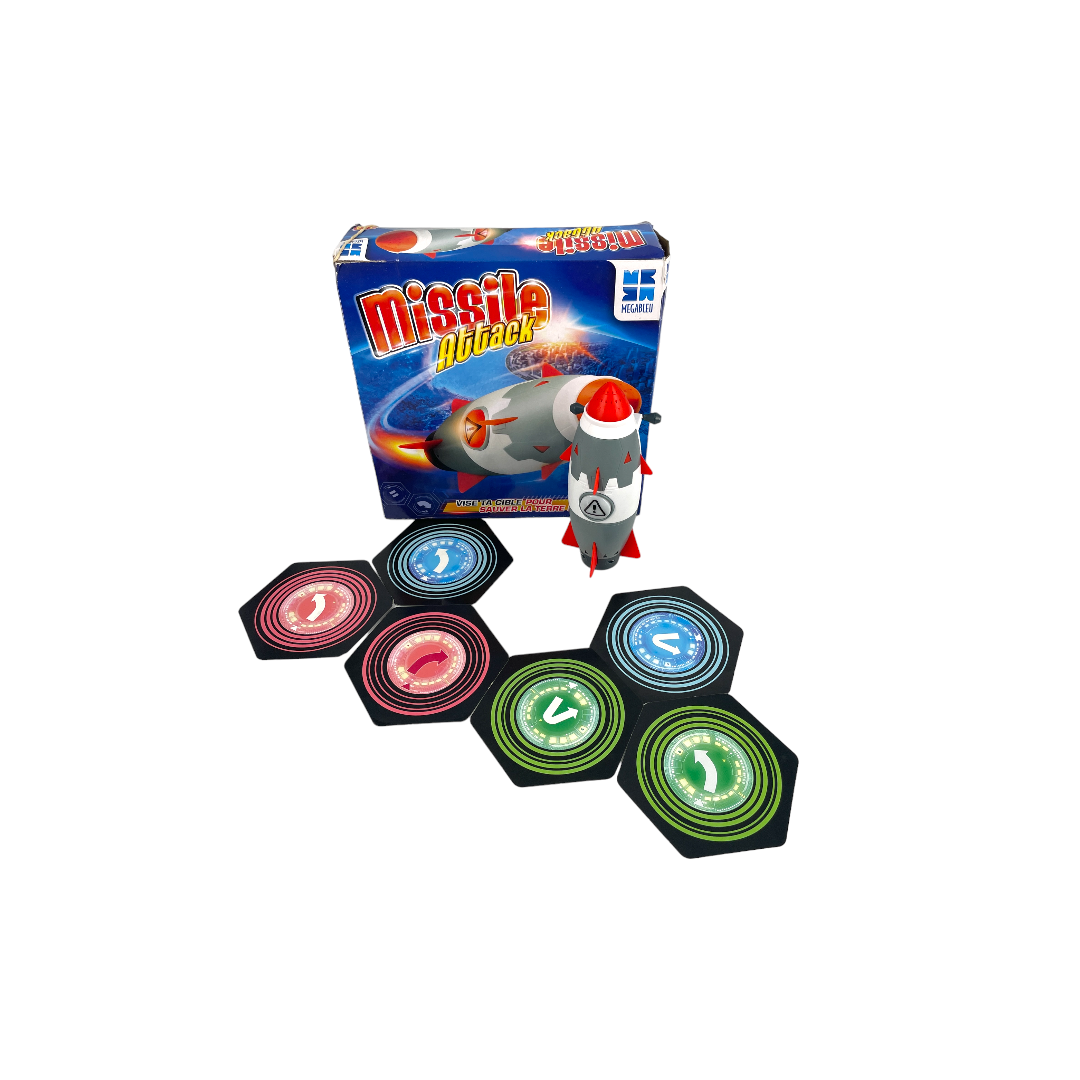 Dévie la trajectoire du missile pour qu’il explose dans l’océan ! Chaque joueur est identifié par une couleur et reçoit une carte cible-océan, ainsi que 3 cartes-code recto-verso (à droite, à ...gauche et demi-tour). Observez attentivement le missile car sa lampe LED s’illumine et change de couleur de manière aléatoire. Dès que votre couleur apparaît, placez vite une carte-code devant le missile pour contrôler sa trajectoire et le faire aller vers la cible des autres joueurs. Le premier joueur qui atteint la cible fera exploser le missile et gagne la partie ! Nombre de 1 -3 joueurs.