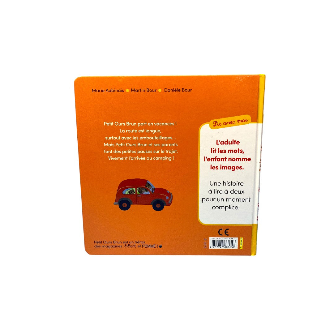 Auteur : Marie Aubinais Petit Ours Brun part en vacances ! La route est longue , surtout avec les embouteillages ... Mais Petit Ours Brun et ses parents font des petites pauses sur le traj...et . Vivement l'arrivée au camping ! Référence : 9782747081658