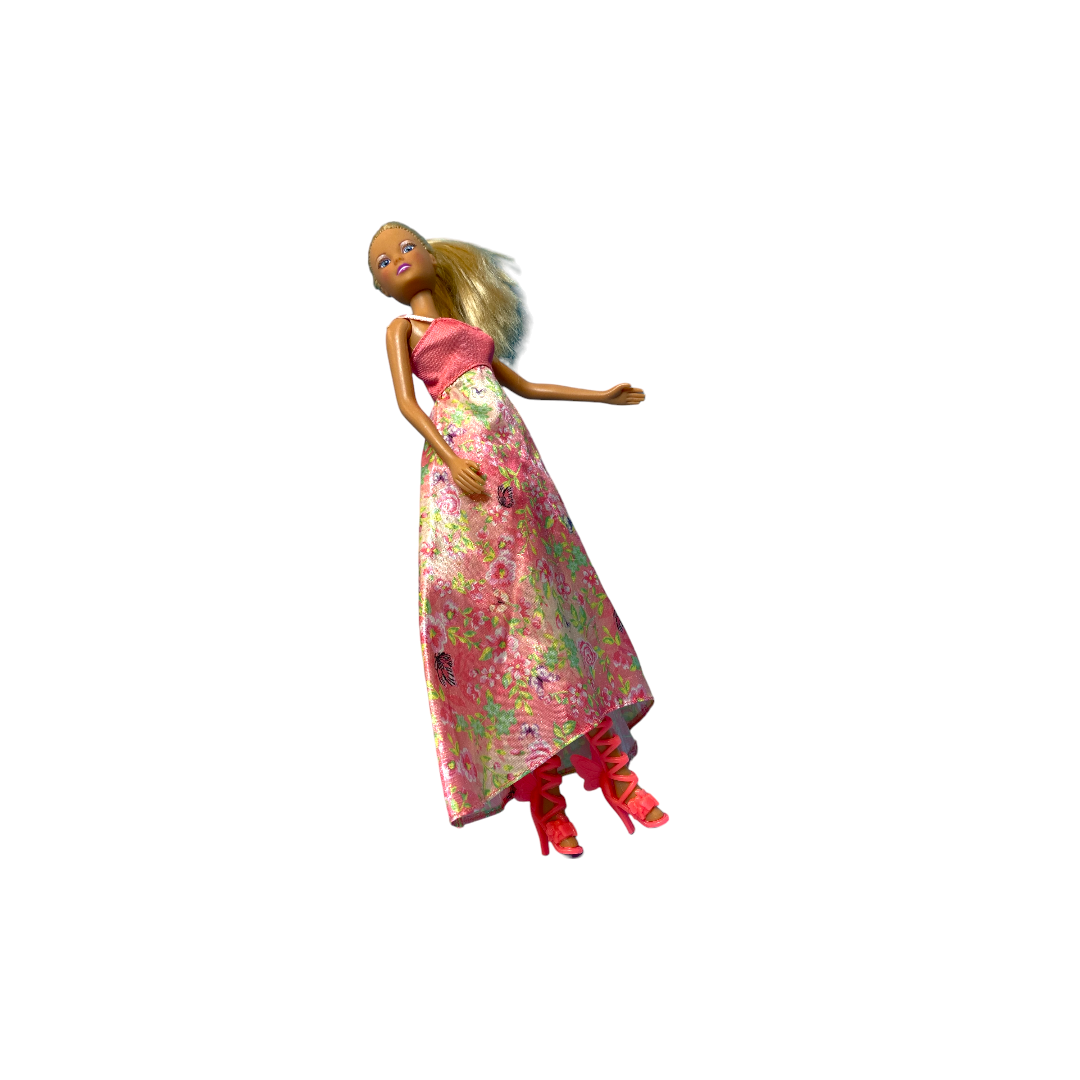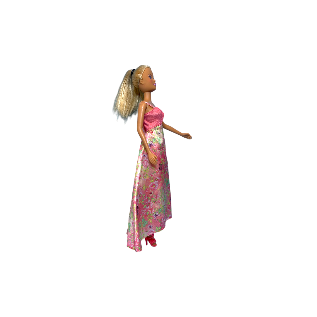 Poupée blonde coiffée d'une queue de cheval, portant une longue robe de ville à bretelles de couleur rose à fleurs, et des chaussures roses à talons.