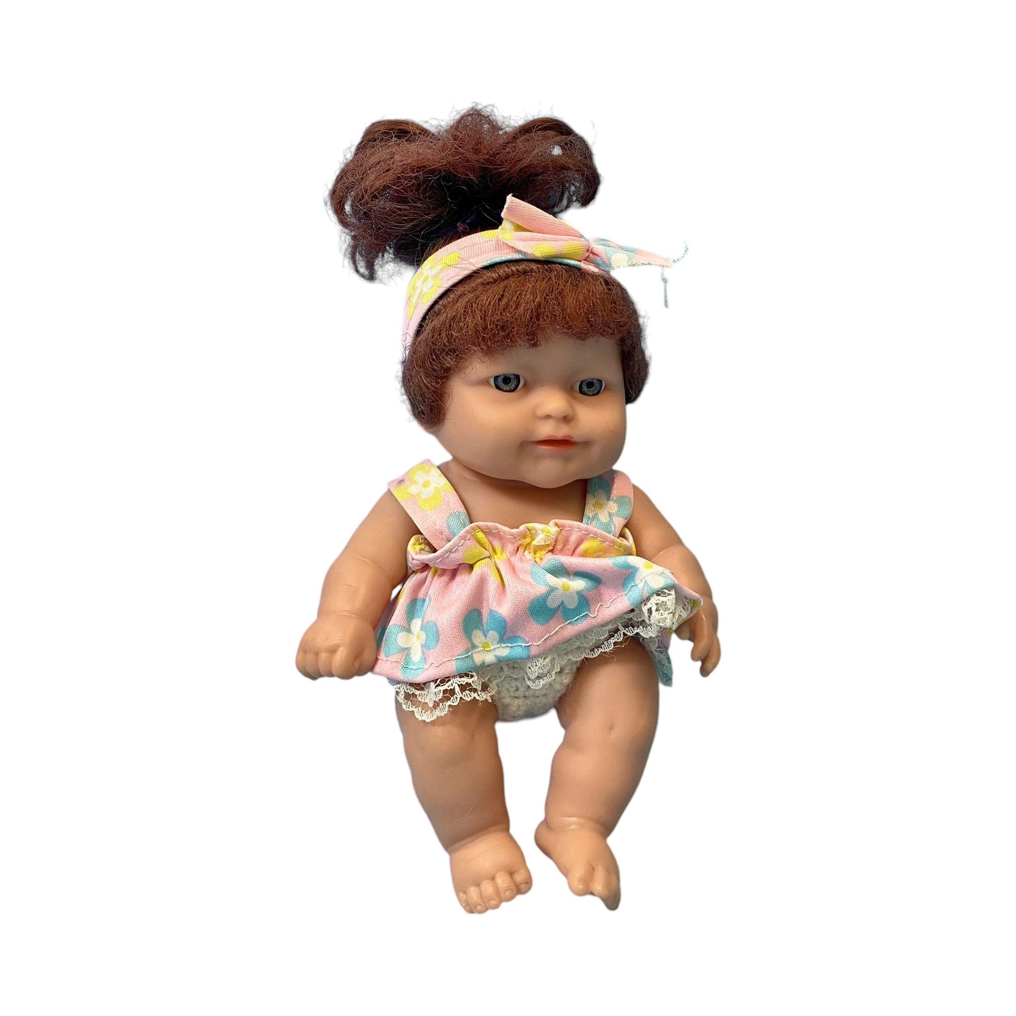 Poupée aux cheveux roux, coiffée d'un serre-tête. Elle porte une robe à bretelles avec des fleurs.