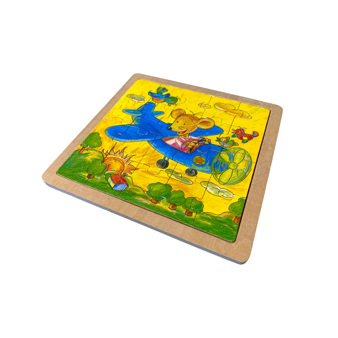 Jouet en bois à emboiter, composé de 20 pièces et représentant une souris dans un avion.