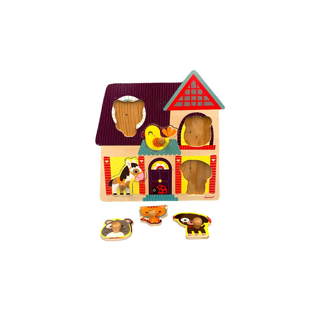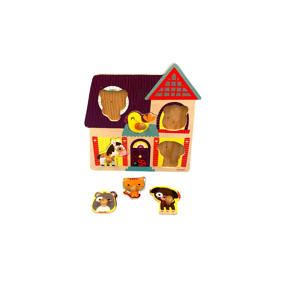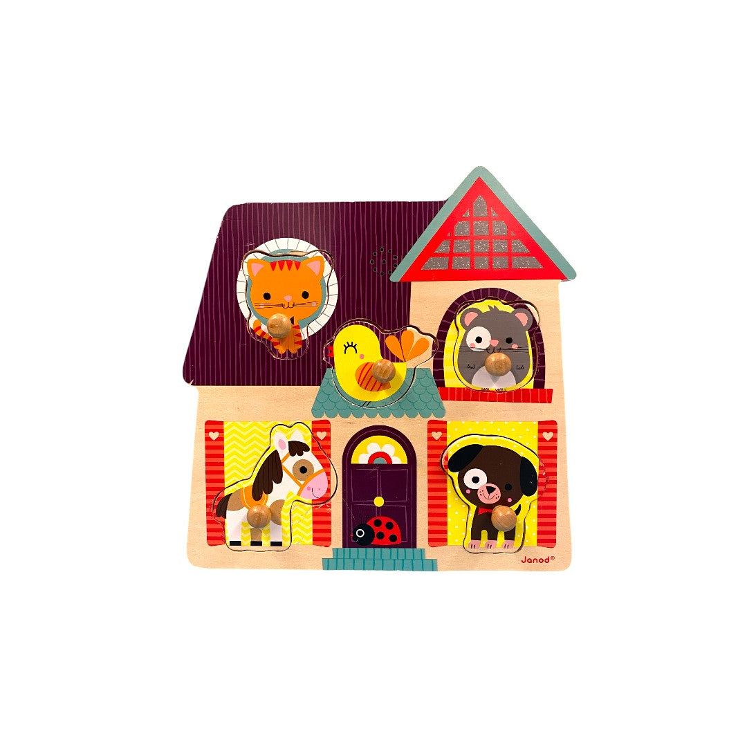 Ce puzzle sonore sur le thème des animaux de compagnie, aidera votre enfant à reconnaître le cri des différents animaux (chien, oiseau, hamster, chat, cheval). En posant la pièce de puzzle à l...a bonne place, le cri de l’animal correspondant retentit. Grâce aux tenons en bois, la prise en main des pièces de puzzle est plus facile. Puzzle en bois (plywood) avec 5 pièces à tenons. Impression par transfert à chaud.
