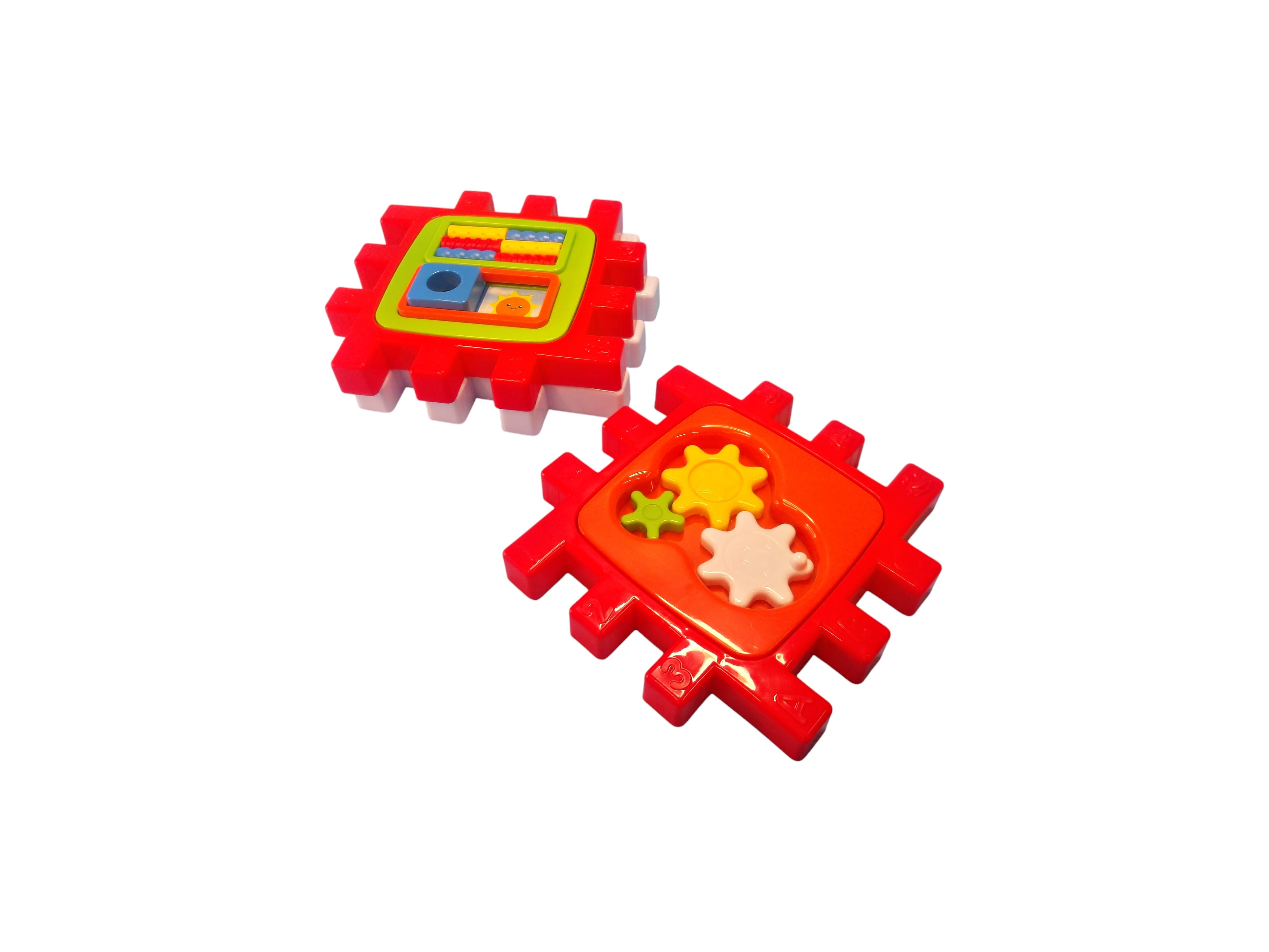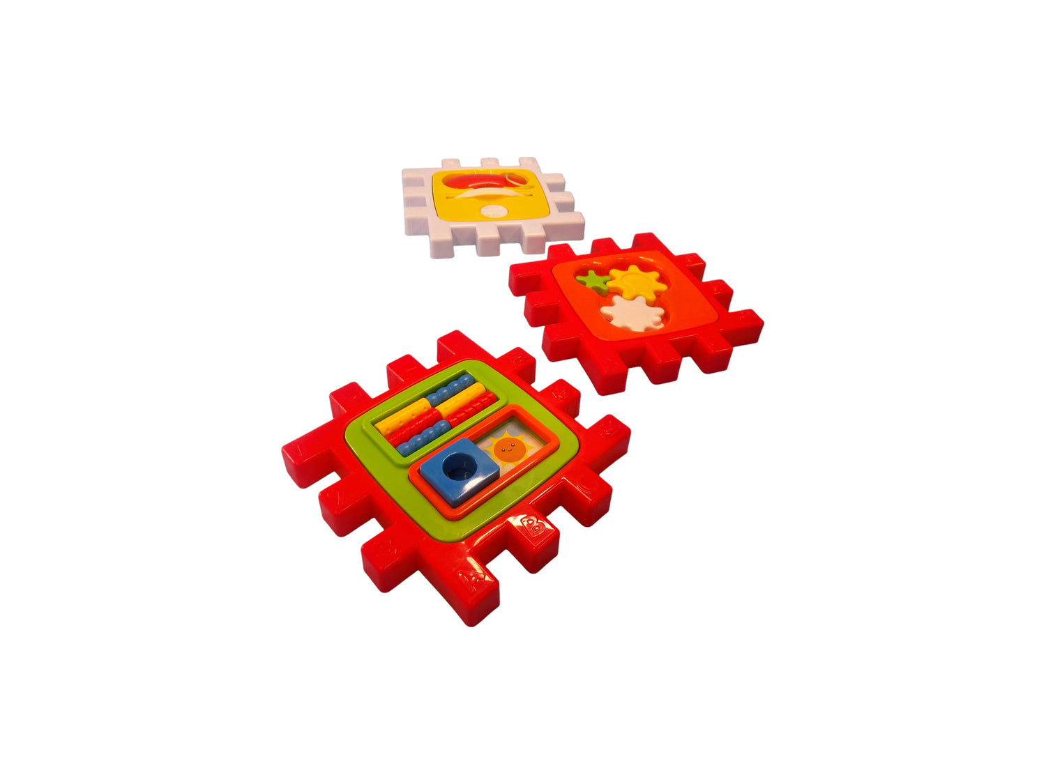 Puzzle à effet musical 4 pièces rouge et blanche chaque pièces comprend une activité différente développant la motricité et l'éveil sensoriel des très jeunes.