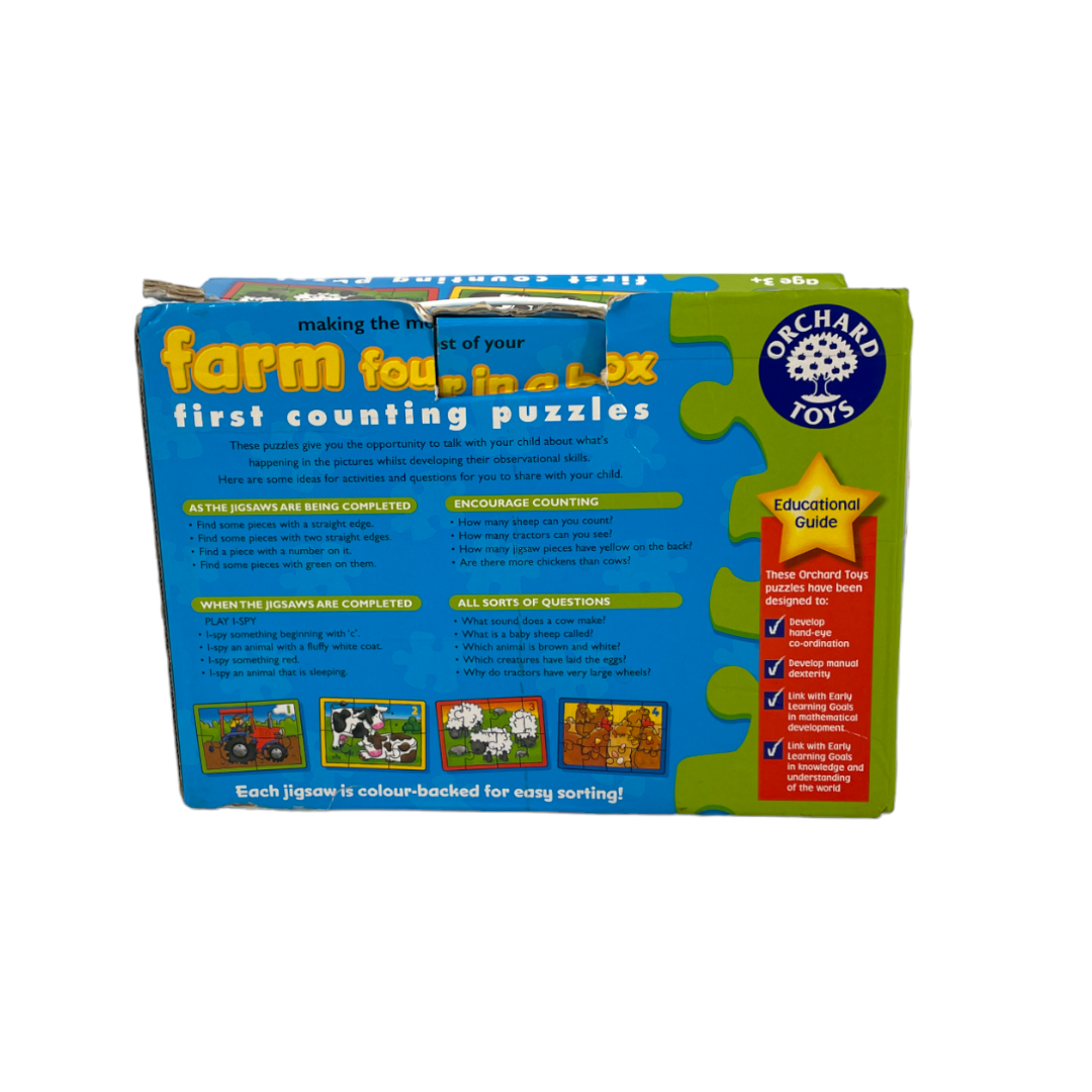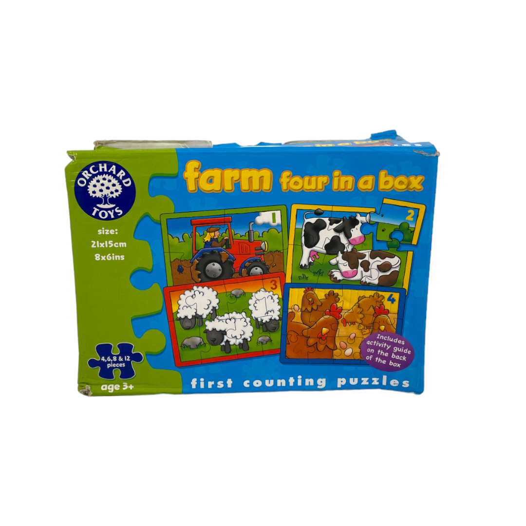 Farm 4 in the box. Boite de 4 puzzles évolutifs sur le thème des animaux de la ferme : - 1 puzzle 4 pièces - 1 puzzle 6 pièces - 1 puzzle 8 pièces - 1 puzzle 12 pièces